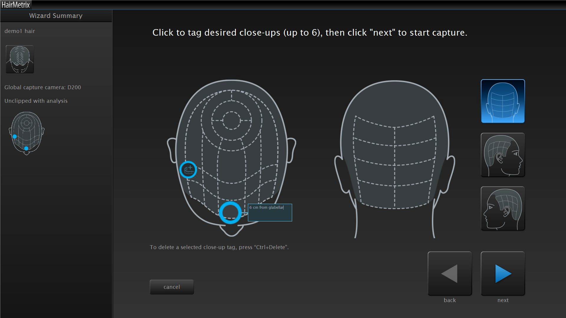 A szakember kiválasztja, hogy a HairMetrix a fejbőr egészéről készült felvételek után mely területek közeli, trichoszkópos felvételeit készítse el, majd elemezze a mesterséges intelligenciával felruházott szoftver segítségével.