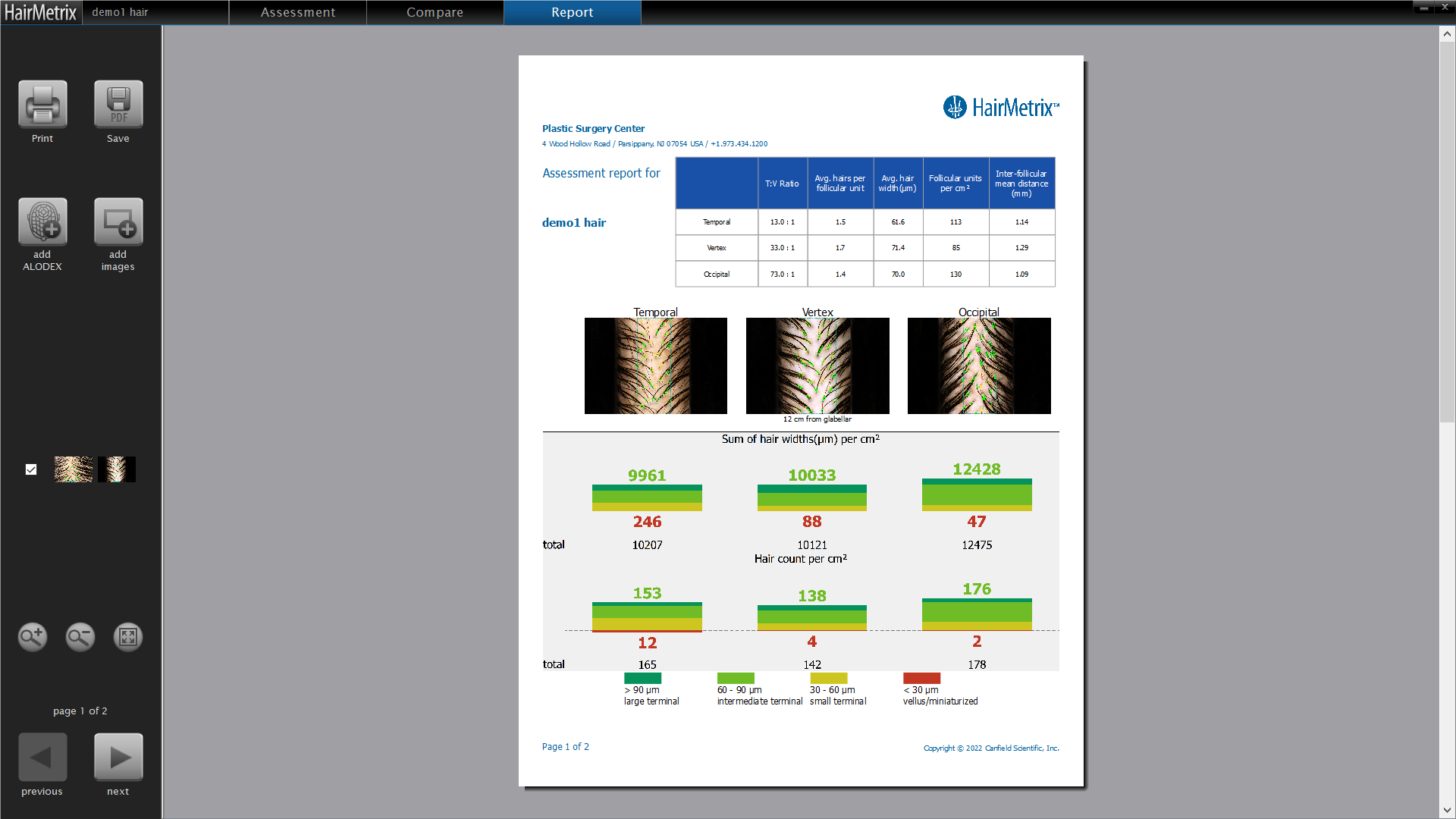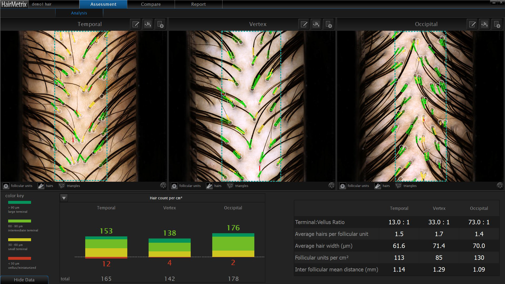 A szakember kijelöli az elemzendő területet, így a szoftver megméri a hajhagymák közötti távolságot, valamint jól láthatóan, apró körökkel jelöli a hajhagymákat a trichoszkópos képeken. A szoftver különböző színkódokat ad a különböző átmérőjű hajszálaknak, a színkódok alapján pedig bekategorizálja a különböző vastagságú hajszálakat. A szakember képes a nagyított trichoszkópos felvétel további nagyítására, így a hajhagymák közelebbről is megvizsgálhatók. A HairMetrix különböző follikuláris egységeket különböztet meg az alapján, hogy hány hajszál nő ki egy hajhagymából, valamint a különböző egységek arányát is megvizsgálja, az arányokat pedig színes oszlopdiagram formájában jeleníti meg. Ezzel együtt a terminális és vellus hajszálak számát, valamint a haj sűrűségét is meghatározza az eszköz. A különböző időben készült fotók összehasonlítása által a haj és a fejbőr változásai könnyedén nyomon követhetők, hiszen a Canfield Hairmetrix minden alkalommal alapos elemzést végez, az adatokat pedig tárolja, így akár több hónap eltéréssel készített trichoszkópos felvételeket is képes elemezni és összehasonlítani.