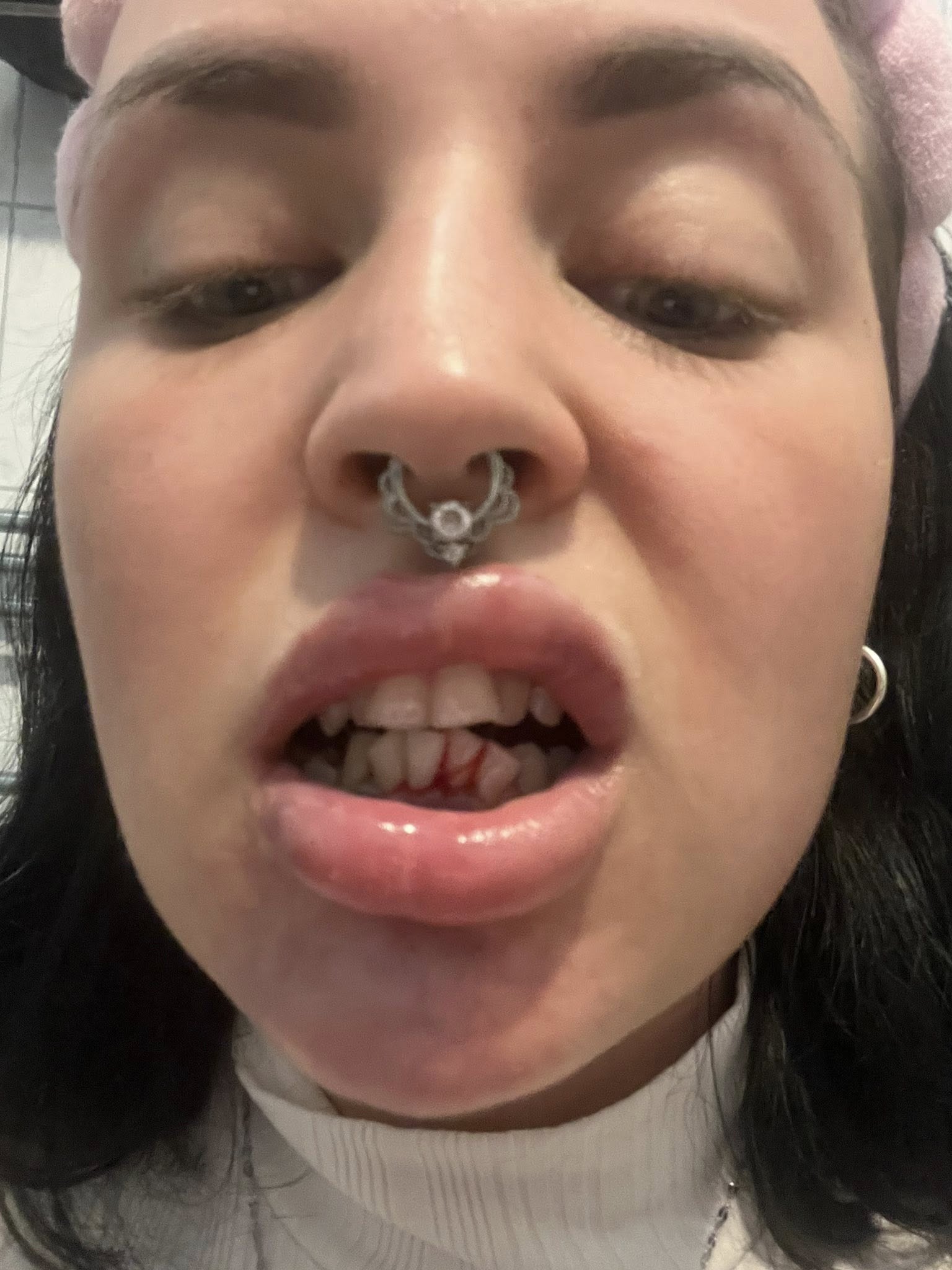 Zsófi már a kezelés közben érezte, hogy valami nincs rendben, fájni kezdett az álla. Mire hazaért, a terület teljesen bekékült, másnapra pedig az ínye is színt váltott: kékes-lilás árnyalatúvá vált. Írt Vivinek, és aggódva kérdezte, hogy normális-e ez az erős fájdalom. A nő megnyugtatta, hogy nincs ok aggodalomra, szerinte ez a reakció teljesen természetes. Azt javasolta, kenje be fekete nadálytő krémmel és vegyen be fájdalomcsillapítót.